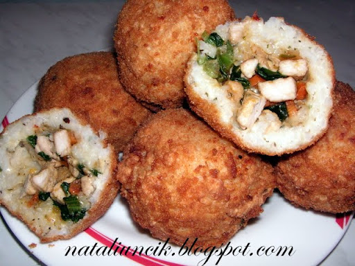 Iš masės suformuot rutuliukus, į vidų dėt įdarą, rutuliukus apvaliot pirma miltuose, po to išplaktuose kiaušiniuose, ir vėliausia džiūvėsėliuose. Puode ar fritiurinei įkaitint aliejų ir atsargiai dėt paruoštus rutuliukus, kept kol neapskrus. Iškeptus rutuliukus sudėt ant lėkštutės, išklotos popierium (kad nutekėtu riebalai). Skanaus